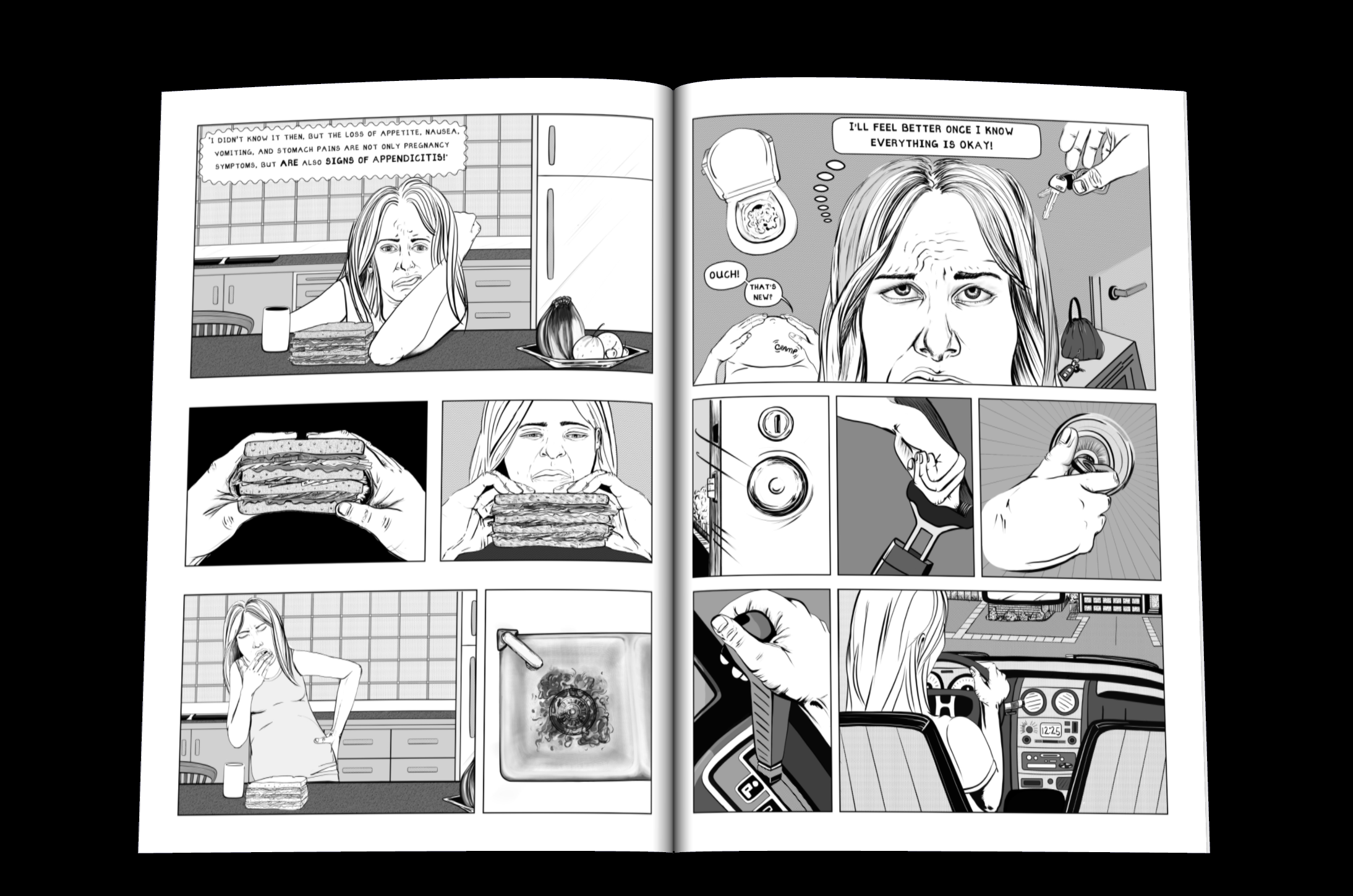 This long-form patient education comic is designed for expectant mothers, weaving together a personal narrative with crucial medical information. The story follows a pregnant woman’s harrowing experience with a misdiagnosed ruptured appendix, emphasizing the challenges, frustrations, and fears she faces throughout the process.