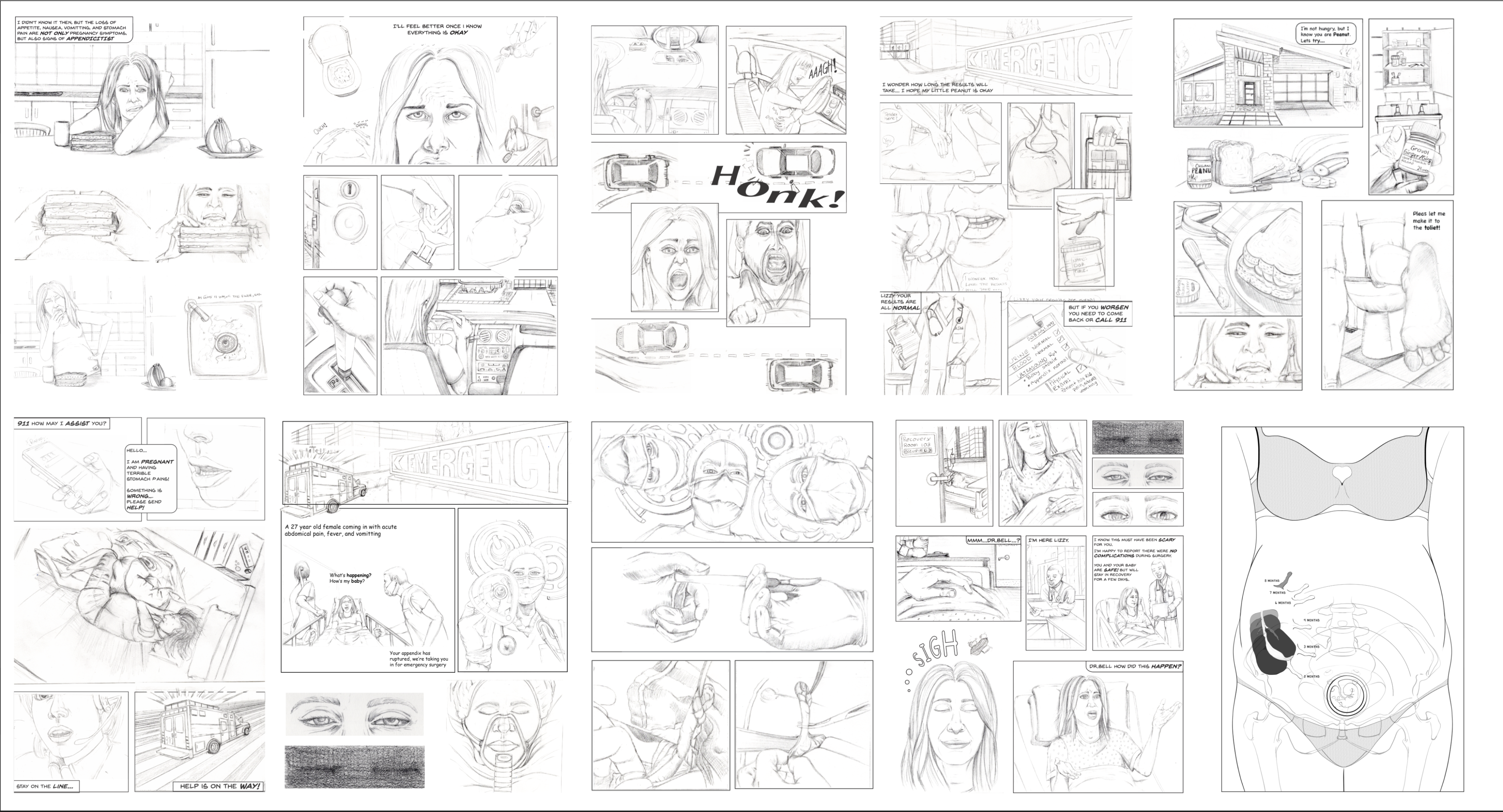 Utilizing the graphic medicine format, this comic effectively combines a compelling personal story with vital educational content. The visual narrative approach makes the complex topic of appendicitis during pregnancy more accessible and engaging for a diverse readership. By employing visuals and limited narration, the comic emphasizes the emotional journey of the patient, fostering empathy in readers.