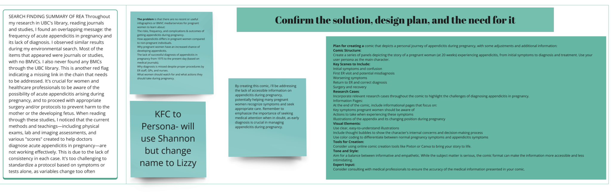 The project began with in-depth interviews of two women who experienced ruptured appendices during pregnancy, both of whom were initially misdiagnosed. This primary research provided valuable firsthand accounts and emotional context. Following the interviews, I conducted an environmental search summary and created user personas and empathy maps.
